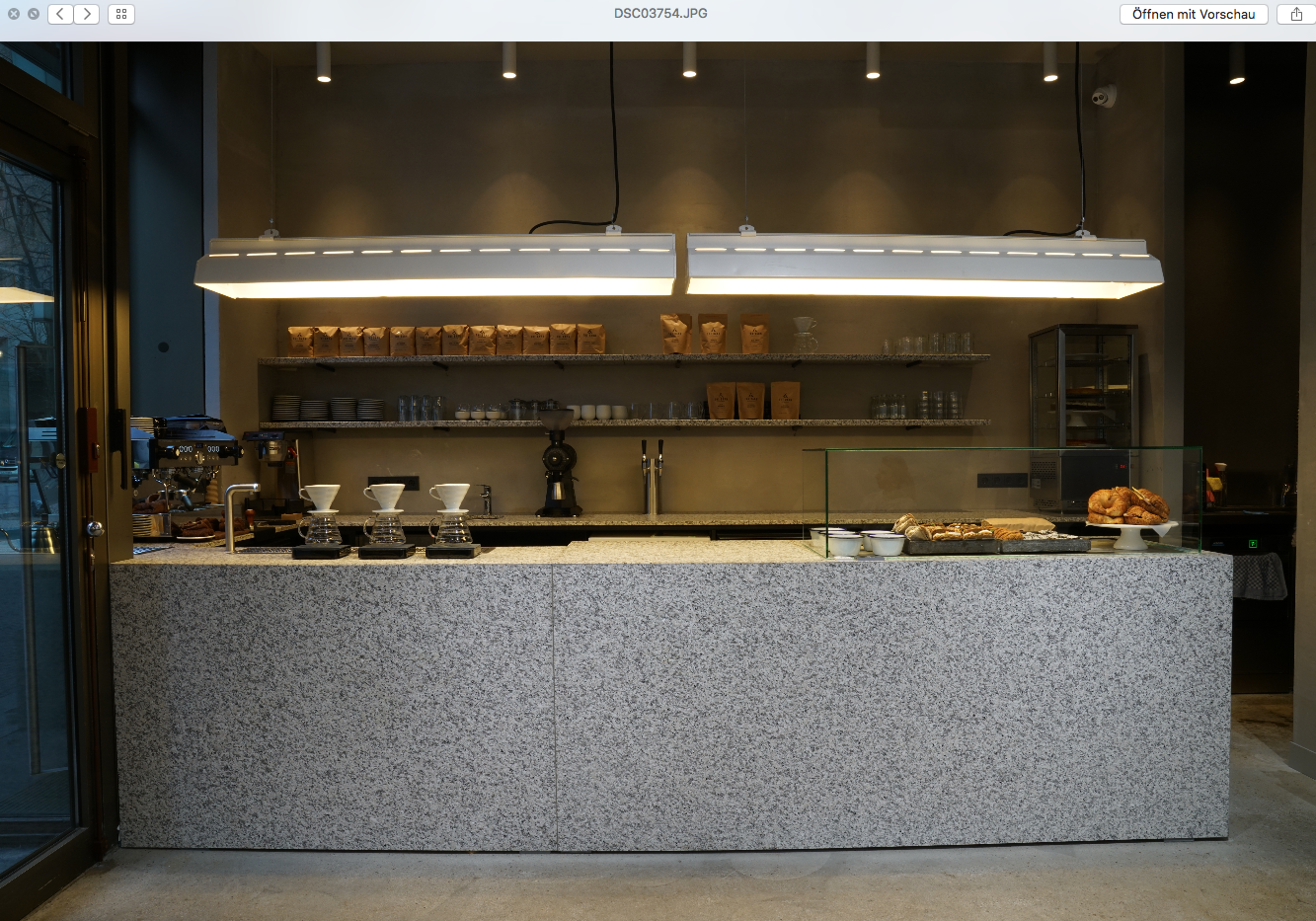 At Potsdamer Platz, the café hides slightly from the rush, built around a granite bar, a floating oak bench, and lighting that reads more gallery than concourse. Their own coffees come as espresso and clean filter, and the setting makes it surprisingly easy to slow down in the middle of Berlin.